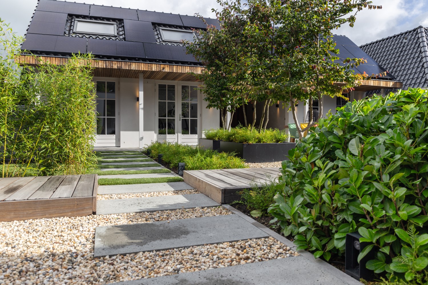 “In combinatie met beton komt het hout nog meer tot zijn recht. De tuin heeft een fraai contrast met lichte en donkere kleuren, waarbij de mooie groene kleur van de planten eruit springt als natuurlijke accenten.”