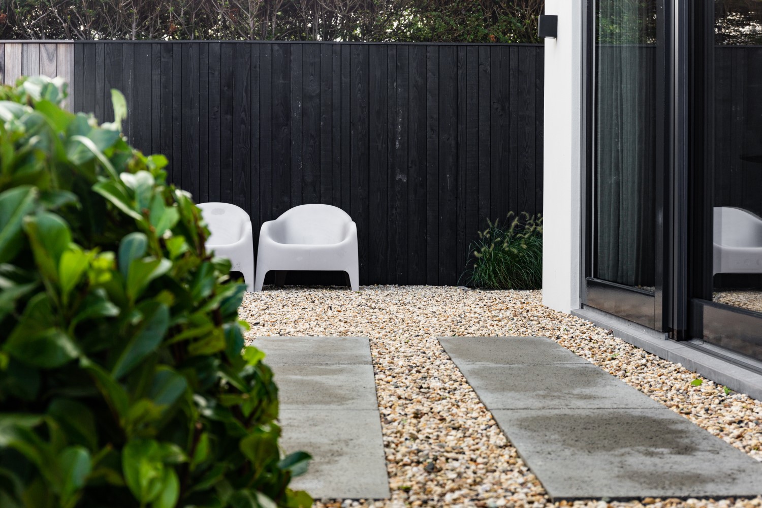 “De zwarte schutting is gemaakt met zwarte douglas planken in diverse breedtematen. De afwisseling van smalle en brede planken geeft extra dynamiek in de tuin. Er gebeurt wat meer, maar tegelijkertijd zorgen de strakke lijnen van het ontwerp dat de tuin toch rust uitstraalt.”
