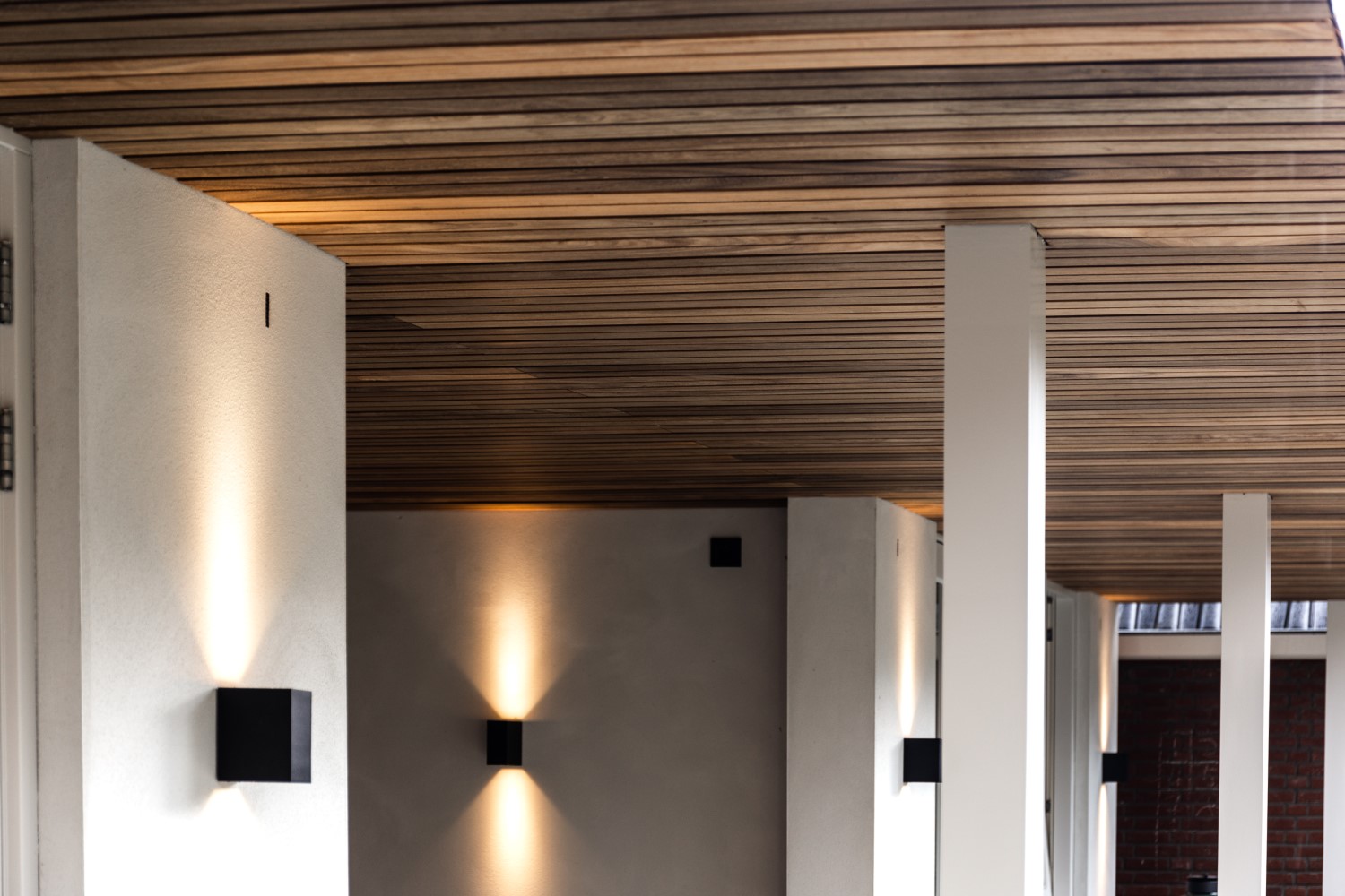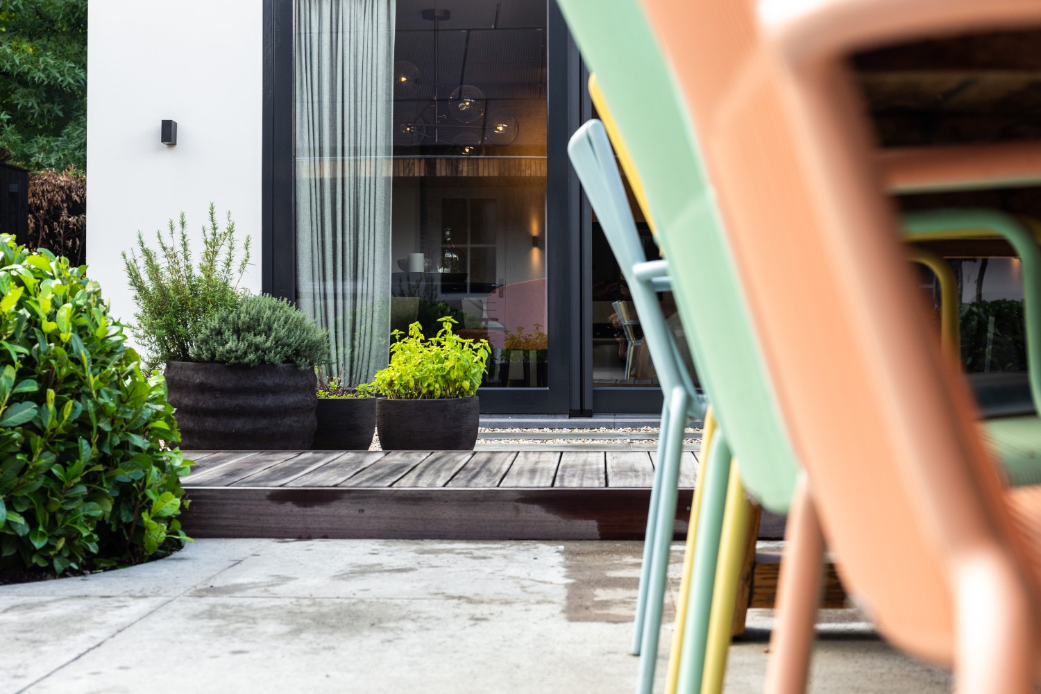 "Wij kiezen voor padoek hout omdat wij graag met natuurlijke materialen werken die een tijdloze uitstraling hebben. Padoek hout behoudt de mooie glooiende nerven ook als het vergrijst. Voor een goede balans in het tuinaanzicht hebben we gekozen voor een padoek plafond in de overkapping en hebben we deze houtsoort ook laten terugkomen in de tuin als vlonder en schutting.”