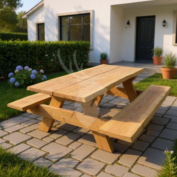 Goed om te weten: deze picknicktafel is een natuurproduct en wordt gemaakt van boomstamplanken die een grillige vorm hebben. Daardoor kan de breedte van het tafelblad en de zittingen wat variëren. Ook in de lengte en houtdikte kan een klein verschil zitten per product.