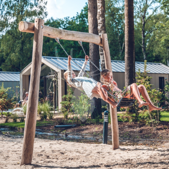Het frame van de schommel is gemaakt van FSC-gecertificeerd robiniahout, afkomstig van de acaciaboom. Dit harde hout, afkomstig uit Europa, staat bekend om zijn grillige, natuurlijke vorm en uitzonderlijke duurzaamheid. De gladgeschuurde palen zijn spintvrij, waardoor kinderen veilig kunnen schommelen. Robinia is bovendien sterker dan bijvoorbeeld een douglas schommel en dus perfect geschikt voor een schommel buiten. Daarnaast is deze houten schommel NEN-gekeurd en daarmee geschikt voor thuis, maar ook voor openbare speelplekken zoals speeltuinen en schoolpleinen.