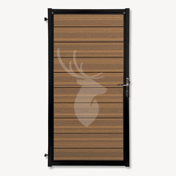 Ben je fan van teak, maar niet van veel onderhoud? Dan is dit de perfecte tuinpoort voor jou! Gemaakt van onderhoudsarme composiet planken die een warme teakkleur hebben. De lichte nerfstructuur zorgt dat ze op echt hout lijken. En om het geheel nog wat meer karakter te geven zitten de planken in een kader van zwarte aluminium. Een mooie combinatie van de tijdloze elegantie van teak en moderne afwerking.