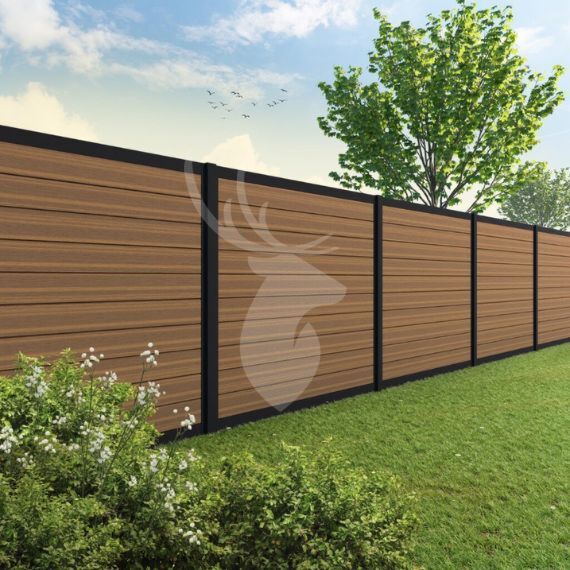 Dit donkerbruine tuinscherm wordt geleverd als bouwpakket met losse Fiberdeck composiet rabatplanken, profielen van zwart aluminium en PVC profielen.
